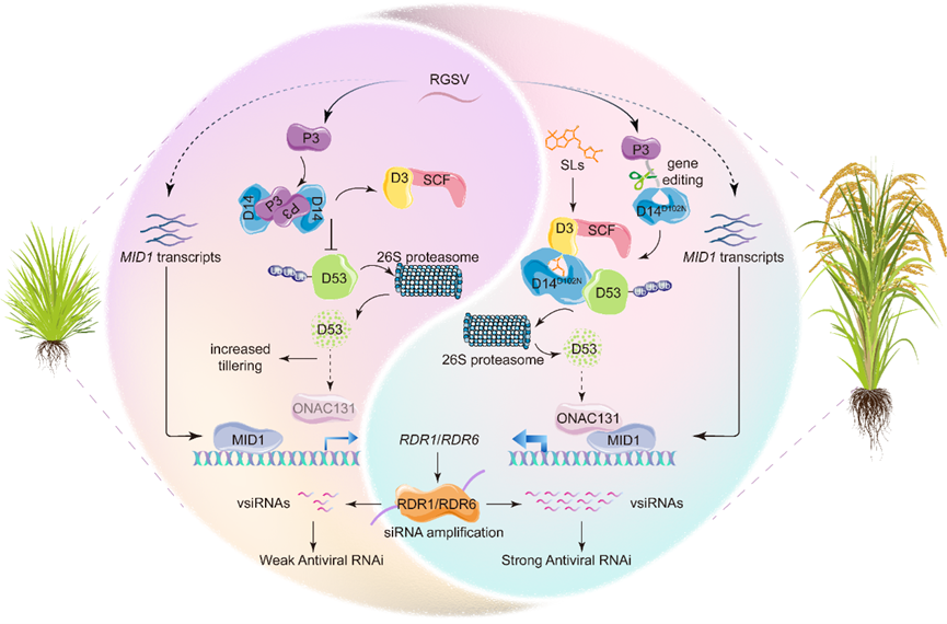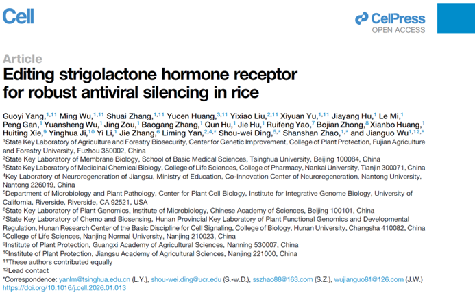 2月24日,我中心吴建国教授团队,联合加利福尼亚大学河滨分校杰出教授丁守伟博士和清华大学闫利明研究员,在 Cell (《细胞》)发表题为“Editing Strigolactone Hormone Receptor for Robust Antiviral Silencing in Rice” (编辑独脚金内酯激素受体强化水稻抗病毒 RNA 沉默能力)的研究论文,在机制层面贯通了独脚金内酯激素信号通路与动植物中高度保守的抗病毒 RNA 干扰(RNAi)免疫体系,推动了植物免疫理论的重大跃升,实现了从机制发现到精准育种应用的完整闭环。