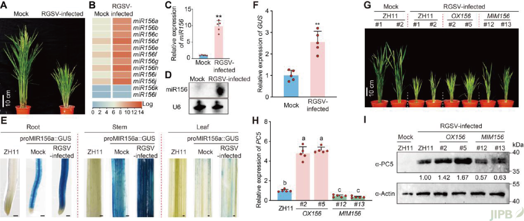 RGSV侵染水稻后,植株表现出典型的矮化、黄化和过度分蘖等症状。通过转录组测序、qRT-PCR和Northern blot分析,研究人员发现RGSV侵染显著上调miR156a–j的积累水平。进一步利用MIR156a启动子驱动的GUS报告系统证实, RGSV侵染可显著激活MIR156a的转录活性。在功能验证中, miR156过表达材料 (OX156) 在RGSV侵染后表现出更严重的病症和更高的病毒积累; 而miR156功能抑制材料 (MIM156) 则显著减轻发病症状并降低病毒积累量。这些结果表明, RGSV通过激活MIR156转录并促进miR156积累,从而增强其致病能力 (图1)。