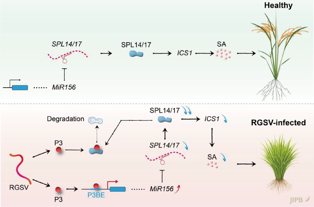 Zhang, B., Zou, J., Ma, B., Dong, C., Zhang, X., Li, N., Duan, X., Liu, R., Zhao, S., Zhang, S., et al. (2026). A viral strategy to hijack the miR156–SPL–ICS1 module suppresses salicylic acid-based immunity in rice. J. Integr. Plant Biol. https://doi.org/10.1111/jipb.70174