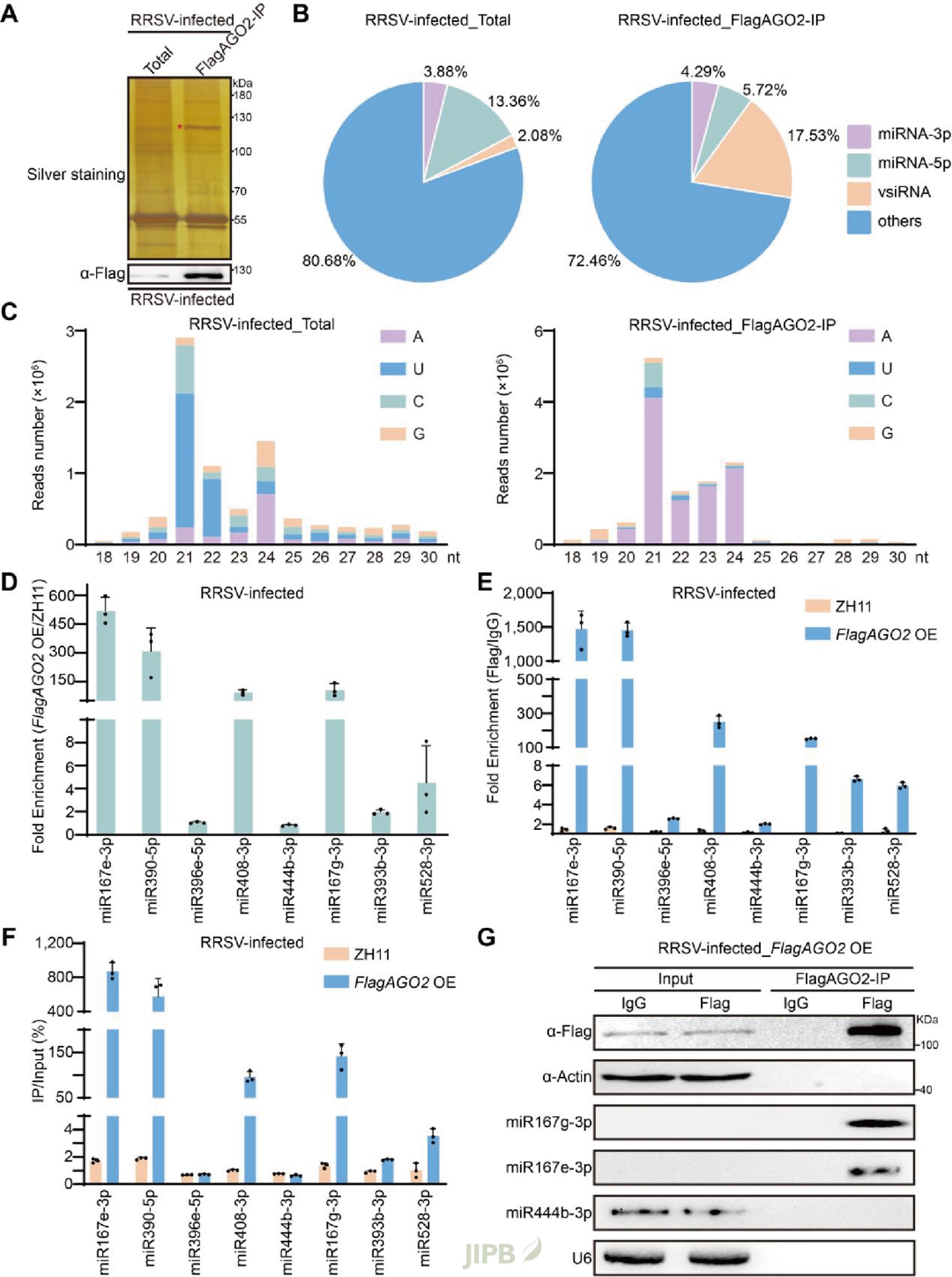 2.AGO2在感染背景下的小RNA选择性装载与下游调控网络在解析AGO2在病毒背景下的小RNA装载特性时, 研究发现AGO2在RRSV感染条件下具有明显的装载偏好, 其选择性结合miRNA的3p链miR167g-3p, 并同时加载病毒衍生的小RNA (vsiRNAs)。这一发现表明, AGO2在病毒侵染环境中对小RNA的识别具有动态选择性 (图2)。